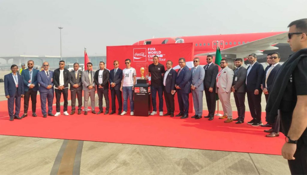বুধবার (১৪ জানুয়ারি) সকাল ১০টার দিকে হযরত শাহজালাল আন্তর্জাতিক বিমানবন্দরে বিশ্বকাপ ট্রফি বাংলাদেশে আনুষ্ঠানিকভাবে বরণ করা হয়। এটি বাংলাদেশের জন্য ফিফার ট্রফি ভ্রমণের চতুর্থবারের মতো সফর। এসময় ফিফার পক্ষ থেকে উপস্থিত ছিলেন ব্রাজিলের ২০০২ বিশ্বকাপ জয়ী মিডফিল্ডার গিলবার্তো সিলভা।আগামী ১১ জুন মেক্সিকো থেকে শুরু হতে যাওয়া এবারের বিশ্বকাপে প্রথমবার ৪৮ দল অংশগ্রহণ করবে। বিশ্বকাপের আনন্দোৎসব শুরুর আগেই ফিফার ঐতিহ্যবাহী ট্রফি ভক্তদের চোখে পড়ার সুযোগ করে দিচ্ছে।